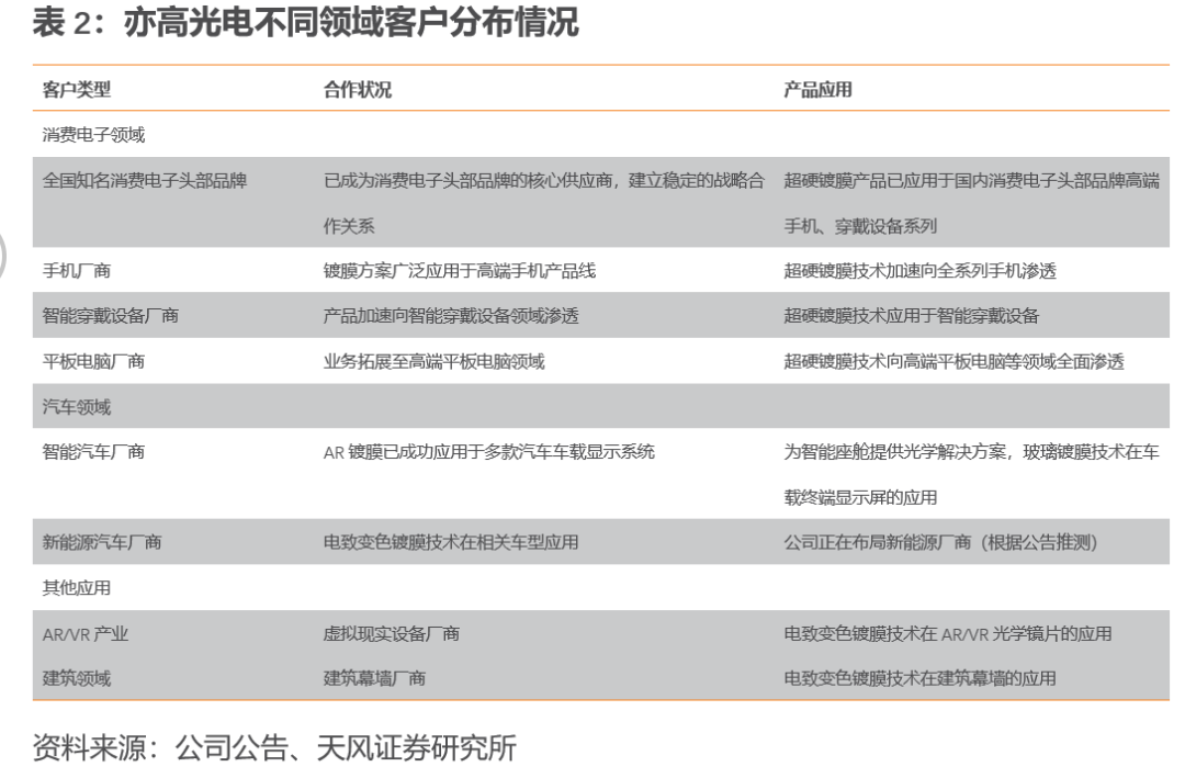 亦高光电自2020年成立以来,围绕真空镀膜材料逐步打造出涵盖超硬镀膜、超硬AR镀膜、NCVM颜色镀膜等在内的产品体系。亦高光电在材料、设备与工艺方面形成完整的技术体系,并通过持续迭代升级,在高端真空镀膜领域技术领先,成长为消费电子头部品牌的重要供应商。尽管目前规模有限,但技术方向聚焦、客户认证路径清晰。目前,亦高光电超硬镀膜已应用于国内消费电子头部品牌高端手机、穿戴设备系列,并加速向全系列手机、智能穿戴设备和高端平板电脑等领域渗透;其AR镀膜已应用于多款汽车车载显示系统,为智能座舱提供光学解决方案。此外,标的公司还布局电致变色镀膜技术,业务前景广阔。未来,随着下游需求向泛智能硬件与车载电子领域持续拓展,标的公司有望充分释放业绩潜力,实现规模性增长。