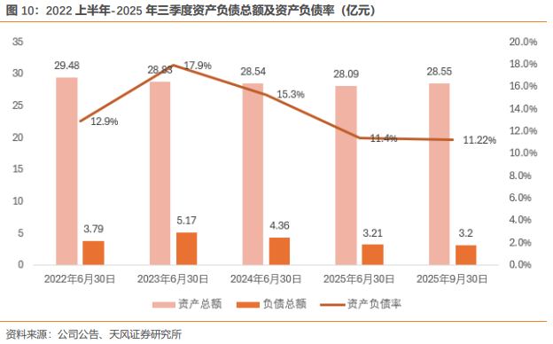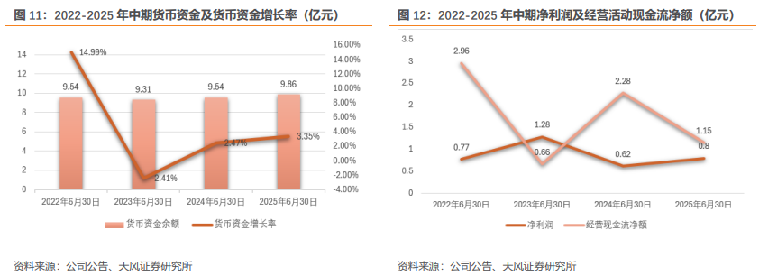 从资产负债表来看,秦安的资产负债率持续维持低位。根据秦安股份半年报,公司从 2022年到 2024 年半年报的资产负债率分别为 12.9%、17.9%、15.3%。截至 2025 年半年度末,公司总资产为 28.09 亿元,负债总额仅 3.21 亿元,资产负债率下降到 11.4%左右。总体来看,近年来秦安股份的资产负债率始终保持在 20%以下的低水平,反映出公司以自有资金运营为主,举债经营规模小,抗风险能力强。