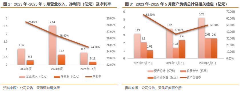 从资产端看,2024–2025年标的公司总资产由3.26亿元增长至5.21亿元,资产规模扩张明显。负债端则增长明显,2024年资产负债率为28.2%,2025年5月增长至51.6%,预计与阶段性投入/预收业务节奏相关。我们认为当前标的公司偿债压力可控,为后续项目建设、产线扩张及新产品推进提供财务安全边际。若并购交易完成,秦安的资金优势将有望进一步强化其资产端扩张与负债稳定的能力。