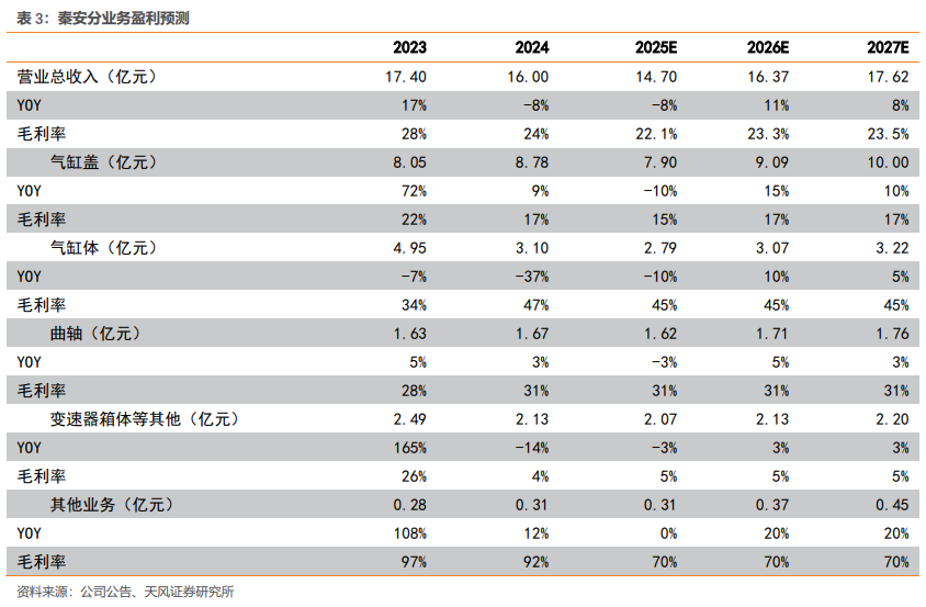 气缸体业务:气缸体板块规模由2022年的5.3亿元下降至2024年的3.1亿元,但自2023年起毛利率改善并在在2024年达到46.9%,预计2025–2027年毛利率将稳定在45%左右,盈利质量保持较高水平。