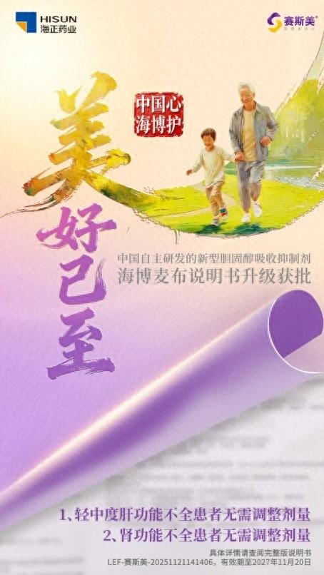 11月24日,海正药业自主原研的1类创新药赛斯美(海博麦布片)说明书迎来重磅消息——对于轻中度肝功能不全患者以及肾功能不全患者,用药时无需调整剂量。此次更新使赛斯美成为全球首个且唯一可用于中度肝功能不全患者的胆固醇吸收抑制剂,标志着海正药业在降脂领域再度迈出坚实步伐,为更广泛血脂异常患者带来治疗新选择。