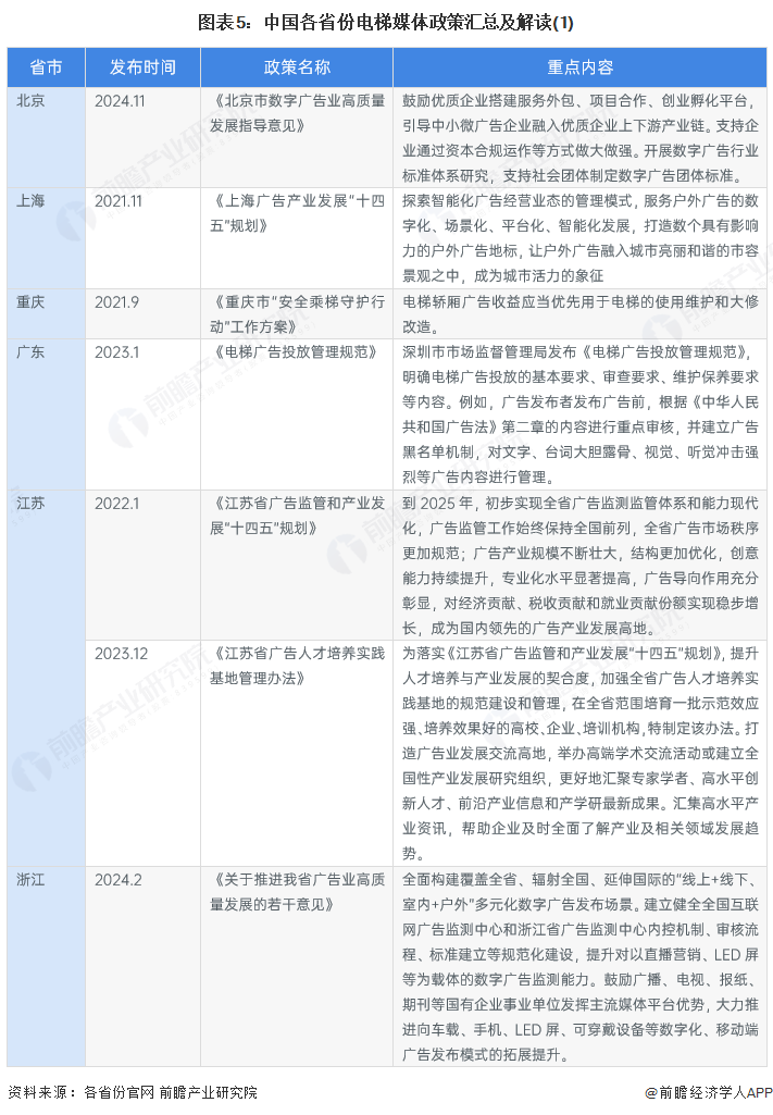 近年来,众多省市发布电梯媒体相关政策,主要内容包括鼓励和规范行业发展,推动行业产业集群建设等。重点省市电梯媒体行业相关政策汇总如下: