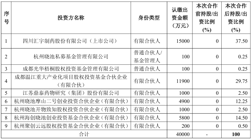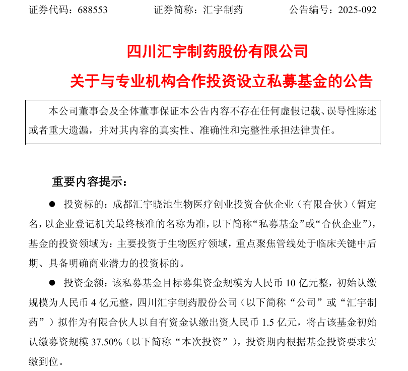 汇宇制药为新设基金第一出资人
