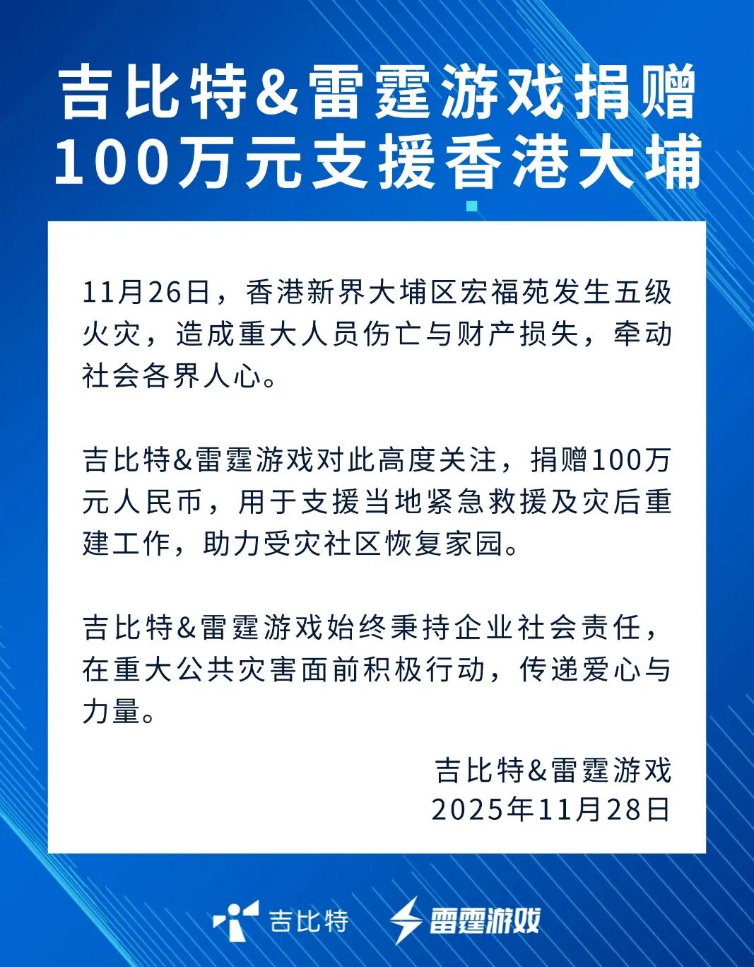 吉比特&雷霆游戏捐赠100万元支援香港大埔火灾救援及灾后重建