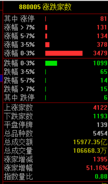 市场共4122只个股上涨,81只个股涨停,1193只个股下跌。