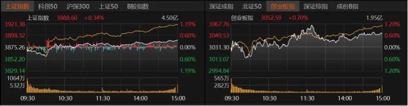 A股延续温和反弹,结构分化。重要指数多数收红,沪指收涨0.34%报3888.6点,创业板指收涨0.7%报3052.59点,深证成指收涨0.85%,科创50收涨1.26%,沪深300、北证50微红,上证50微跌。