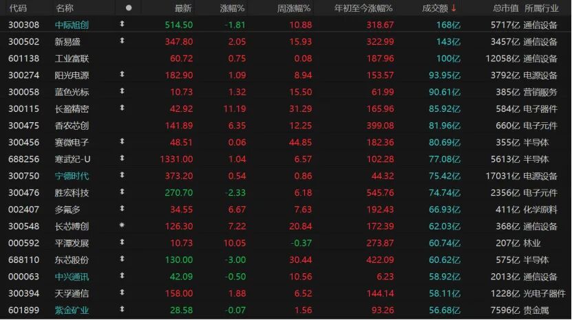 今日,共有4122只个股收涨,涨停股81只;1193只个股收跌,跌停股6只。中际旭创、新易盛、工业富联单日成交额均破百亿,收盘分别报514.5元/股(跌1.81%)、347.8元/股(涨2.05%)、60.72元/股(涨0.75%)。电子器件个股长盈精密收涨11.19%报42.92元/股,化学原料个股多氟多收涨6.67%报34.55元/股。