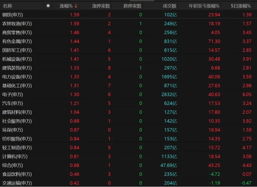 板块普涨,除银行、煤炭板块微跌,其余29个申万一级行业收红,钢铁、农林牧渔、商贸零售、有色金属、国防军工、机械设备、电力设备等板块涨幅超过1%。个股来看,武进不锈、大中矿业、平潭发展、茂业商业、友阿股份、文峰股份等涨停。