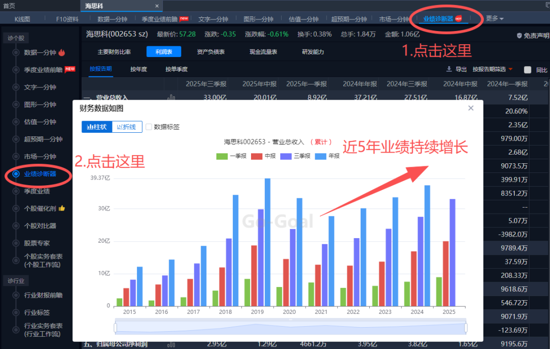 以第一大A股重仓股海思科为例,利用Go-Goal的诊股工具,能够快速诊断这家公司的基本面: