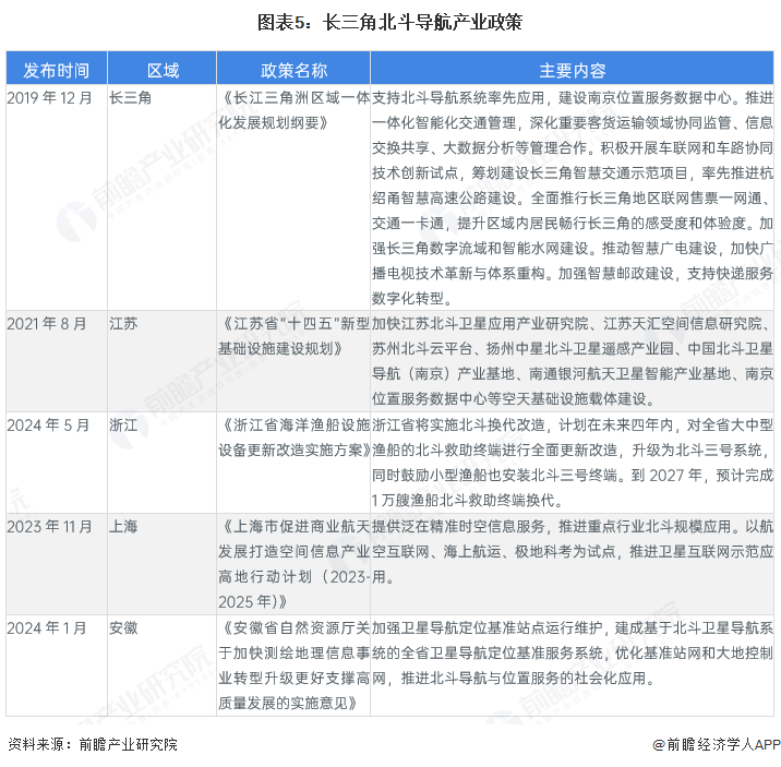 近年来,长三角4大省市相继推出北斗导航相关政策,从北斗导航产业的发展重点看,江苏将着重建设北斗产业应用基地,浙江、上海和安徽则重点推动北斗在船舶、航天、测绘等领域的应用。