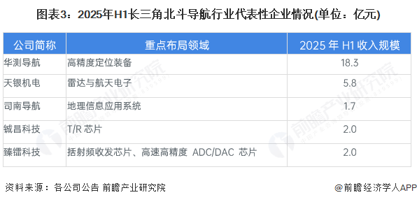 经过多年发展,长三角已经培育了一批北斗导航行业的代表性企业,包括华测导航、天银机电等。从产业布局看,涵盖芯片、导航系统等。2025年上半年,代表性企业中华测导航和天银机电营收规模超过5亿元,企业规模较大。