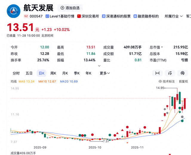 【环球网财经综合报道】近日,商业航天概念股在资本市场表现活跃。截至11月28日收盘,航天发展11天收获7个涨停板,雷科防务5天4板,通宇通讯实现2连板。与此同时,乾照光电、航天环宇以20CM的幅度涨停,顺灏股份、四川金顶也实现涨停。