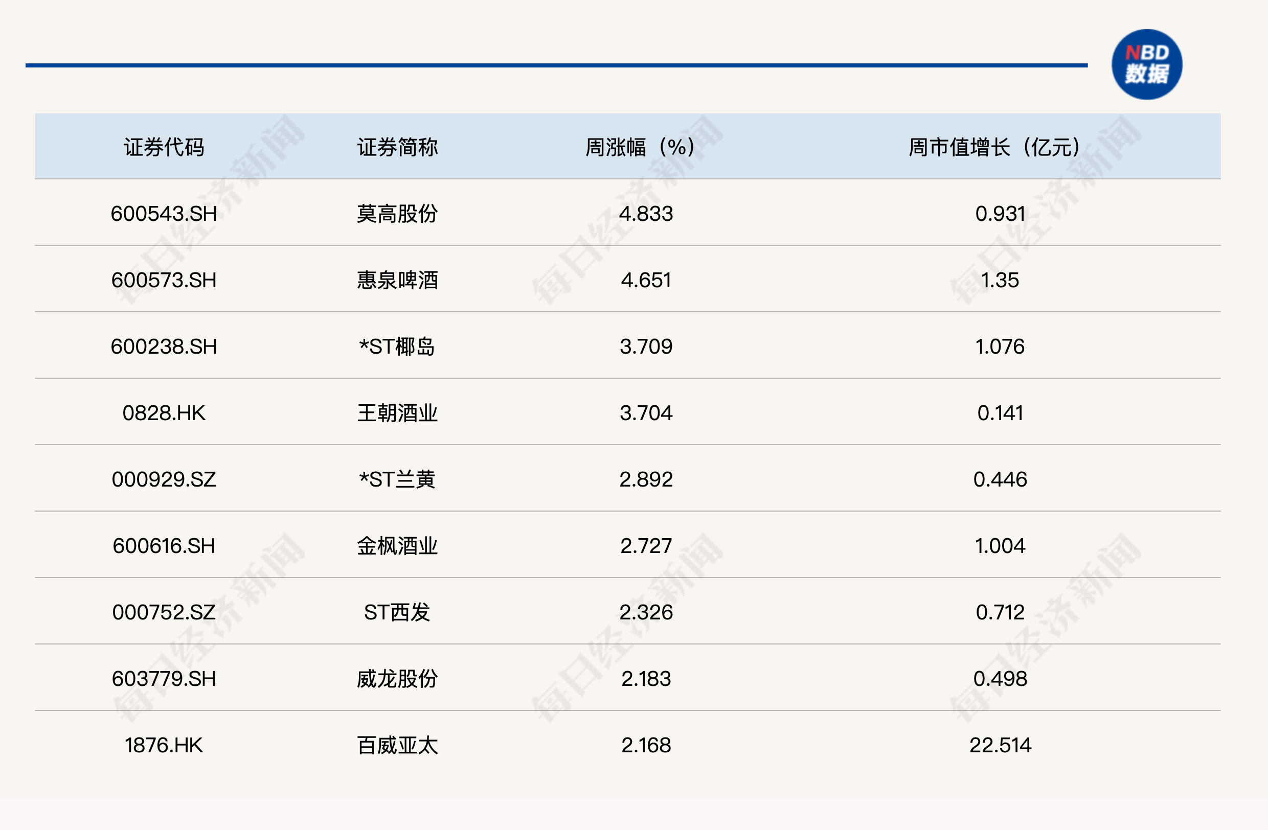 非白酒板块方面,莫高股份(维权)和惠泉啤酒的周涨幅均达到4%;*ST椰岛和王朝酒业的周涨幅也超过3%,涨幅领先。