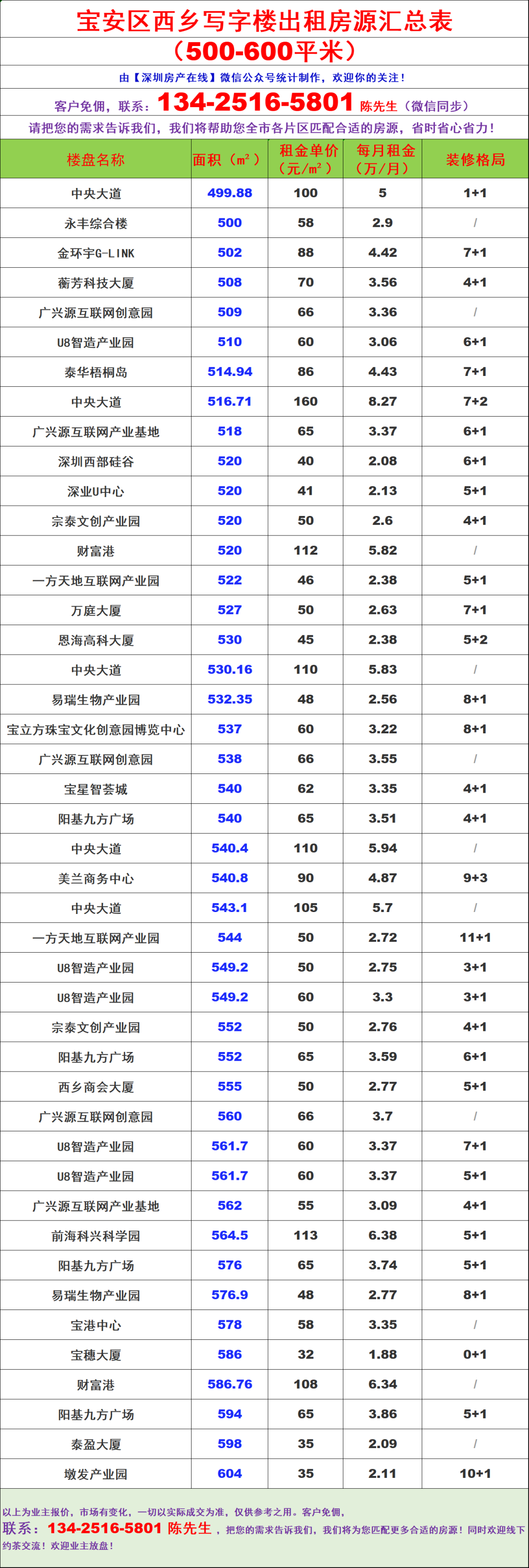 深圳宝安区西乡500-600平米办公室出租招租赁信息
