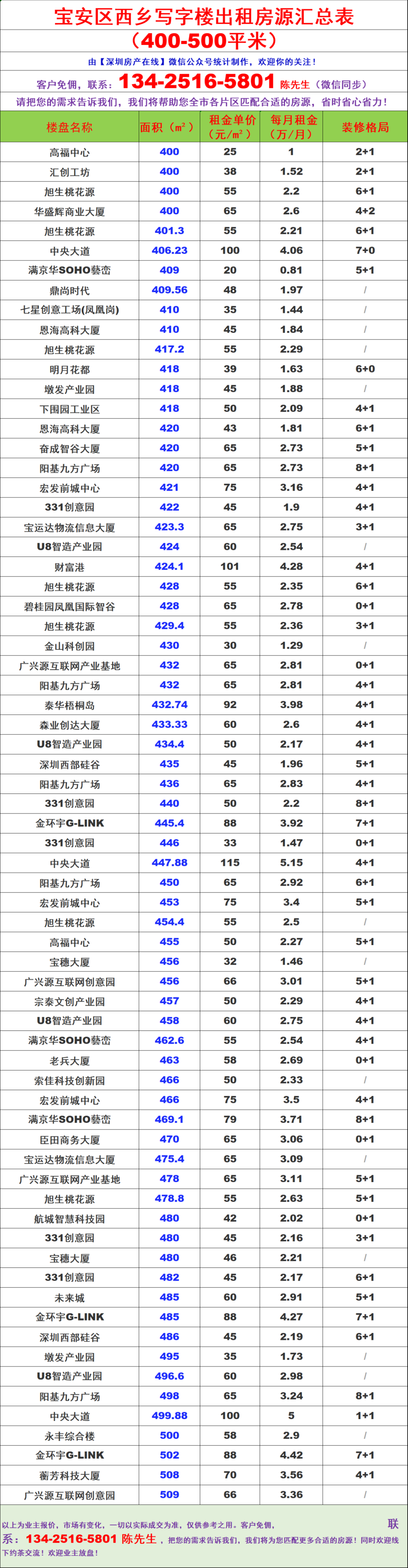 深圳宝安区西乡400-500平米写字楼出租招租赁信息