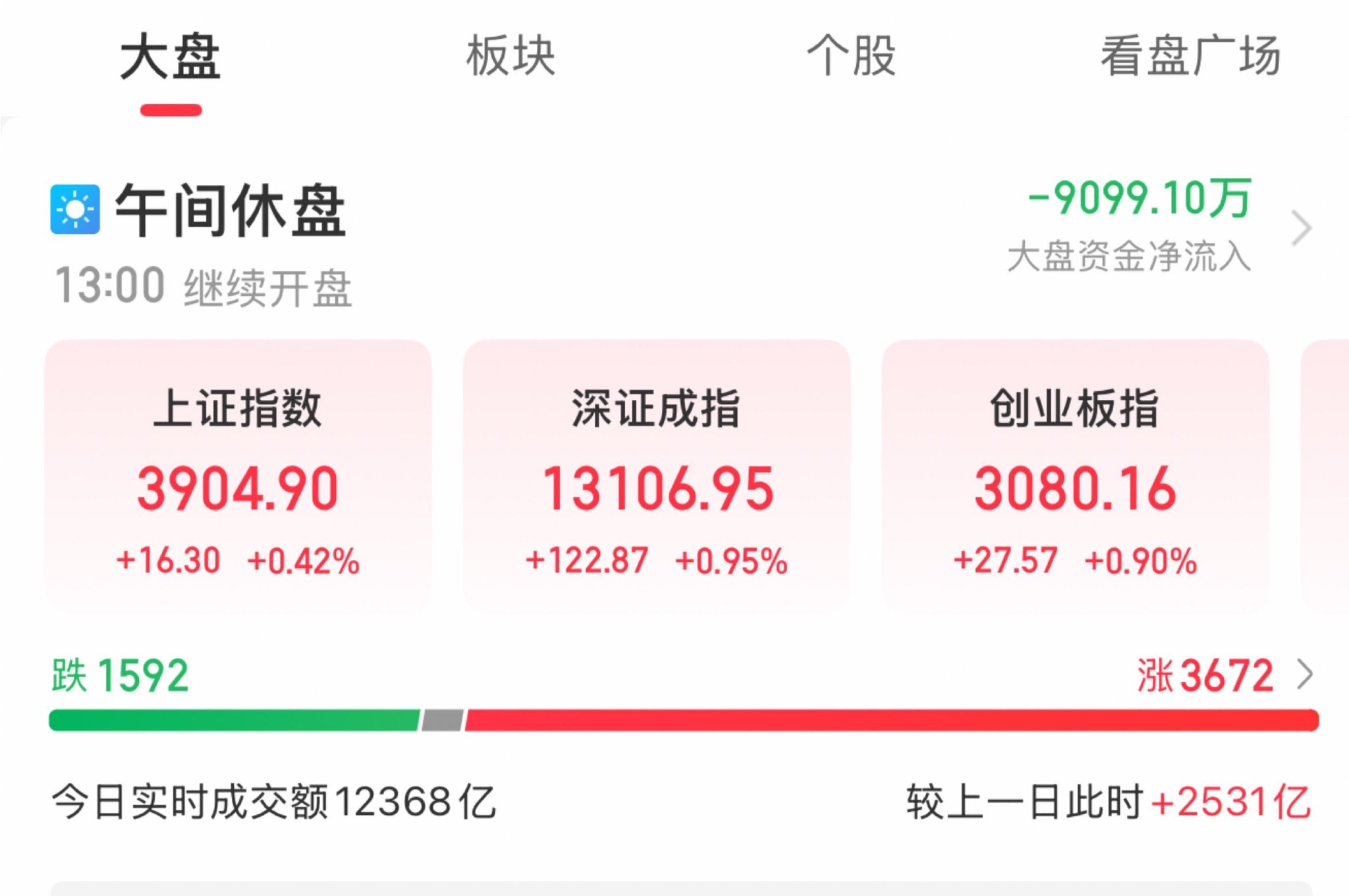 A股三大指数早盘集体上涨,截至午盘,上证指数涨0.42%,深成指涨0.95%,创业板指涨0.9%,北证50涨2.05%。沪深京三市半日成交额12368亿元,较上日放量2531亿元。全市场超3600只个股上涨。