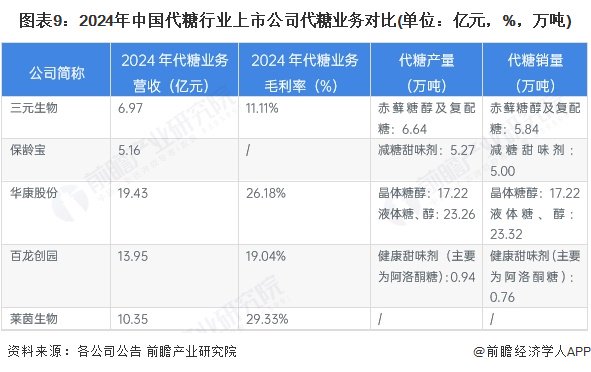 2024年中国代糖行业中,华康股份、保龄宝等企业营收较为领先,其中华康股份代糖营收超过19亿元。从毛利率水平看,三元生物代糖毛利率接近11.11%,华康股份达到26.18%。从产销量上看,华康股份的代糖产销量较大,超过10万吨。