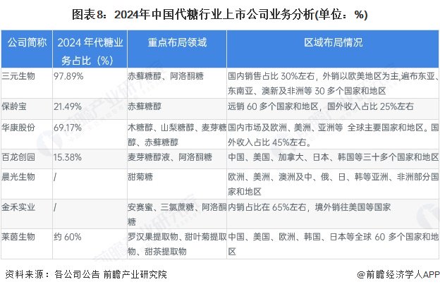 从代糖业务占比看,三元生物、华康股份等企业占比较高;从重点布局领域看,布局糖醇类代糖的上市公司数量较多,包括三元生物、保龄宝、华康股份等,晨光生物、莱茵生物重点布局天然代糖产品;从区域布局看,大部分代糖企业为国内外布局,重点国家和地区为中国、美国、欧洲、日韩等。