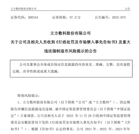 具体来看,立方数科通过开展代理业务、融资性贸易、虚假贸易虚增营业收入、营业成本、利润总额,导致立方数科披露的2021年至2023年年度报告存在虚假记载。其中,2021年,虚增营业收入279,726,668.85元,占当年营业收入的50.09%,虚增营业成本277,114,254.09元,占当年营业成本的60.61%;2022年,虚增营业收入311,855,333.46元,占当年营业收入的51.67%,虚增营业成本305,460,743.11元,占当年营业成本的53.54%,虚增利润总额510,390.73元,占当年利润总额绝对值的0.33%;2023年,虚增营业收入45,869,361.67元,占当年营业收入的24.00%,虚增营业成本45,227,946.58元,占当年营业成本的27.55%,因被认定2021年至2023年连续三年财务造假,安徽证监局拟对公司及10名责任人罚款合计4000万元,其中拟对公司罚款1000万元。