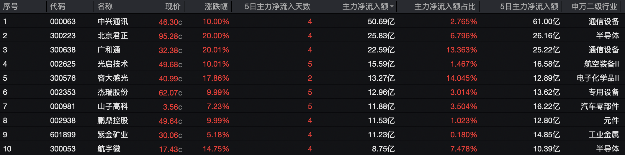 上证报中国证券网讯(记者 窦世平)Wind数据显示,12月1日,当日主力资金净流入额排名前十个股包括中兴通讯、北京君正、广和通、光启技术、容大感光、杰瑞股份、山子高科、鹏鼎控股、紫金矿业、航宇微。净流入金额均超8亿元,最高为中兴通讯,净流入额超50亿元。其中,中兴通讯、北京君正、广和通、航宇微等属于通信设备或半导体板块,两个板块当日资金流入均超70亿元。