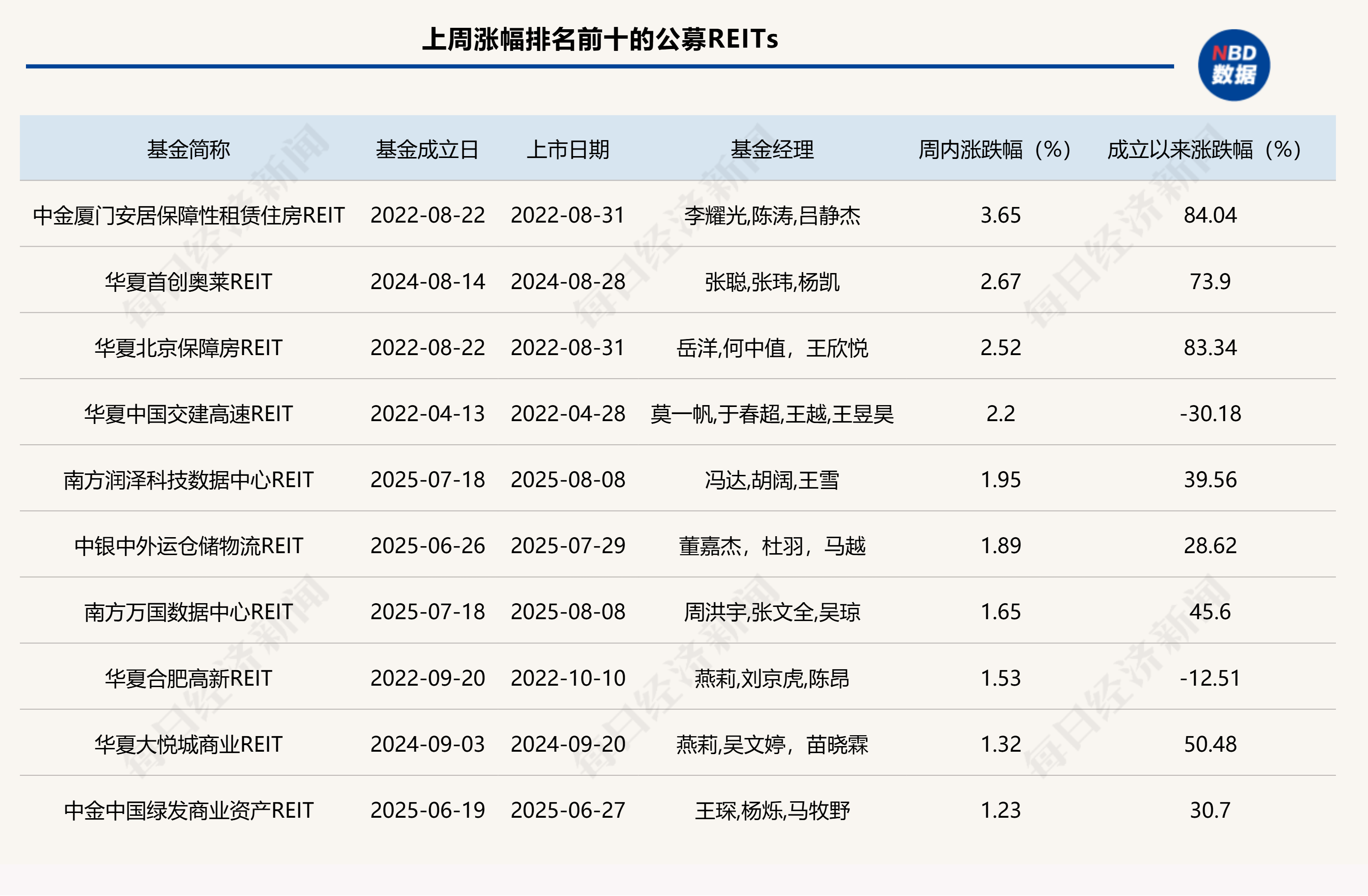 单只产品方面,已上市的77只公募REITs产品中,环比上涨的为35只。涨幅最大的三只产品为中金厦门安居保障性租赁住房REIT、华夏首创奥莱REIT和华夏北京保障房REIT,周内分别上涨3.65%、2.67%和2.52%。