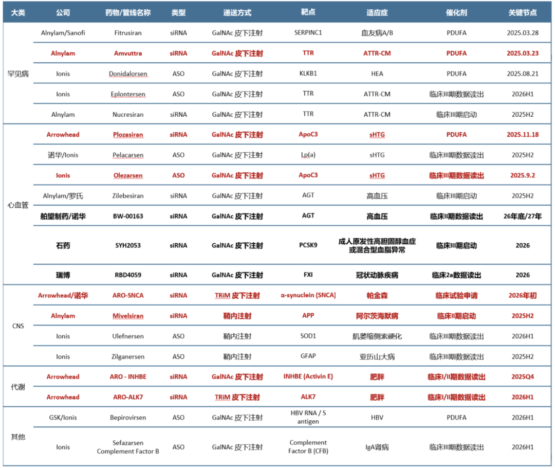 从罕见病到大适应症的突破。据中信建投,小核酸药物不再局限于罕见病,在心血管领域已有成功上市销售的诺华Leqvio,预期销售峰值30亿美元,后续还有Apoc3、lp(a)、AGT靶点药物将会陆续读出III期数据。在CNS领域,Arrowhead 针对帕金森的ARO-SNCA 将会在2026年初递交IND,使得CNS从鞘内注射开始走向跨越血脑屏障,走向更具可及性的皮下注射。在减重领域,Arrowhead靶向脂肪组织的ARO-ALK7预计将会在2026H1 披露临床I期数据,其减脂保肌潜力也可能会成为减重领域的重要革新。