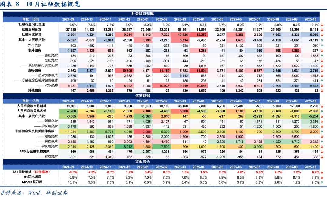 10月社融:11月13日央行披露2025年10月金融数据,其中10月新增社会融资规模8161亿元,同比少增5959亿元,社融存量同比增速8.5%,较上月末下降0.2pct;新增人民币贷款2200亿元,同比少增3604亿元。