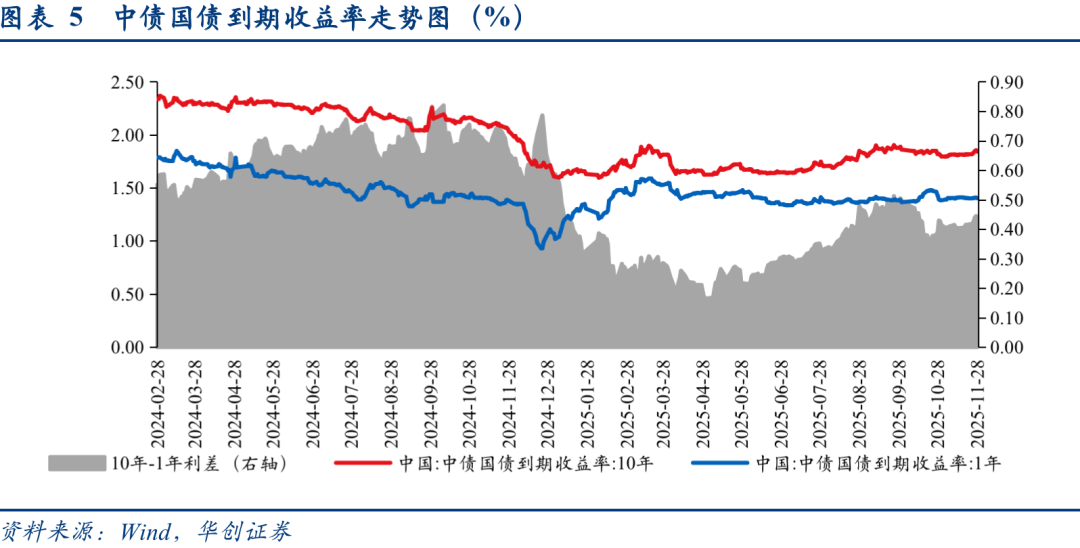 2025年11月,10年期国债利率月末上行,1年期国债利率基本稳定。11月,10年期国债利率,中上旬保持在1.80%左右,中下旬突然上行至月末1.84%。1年期国债利率月初月末基本稳定在1.40%左右。