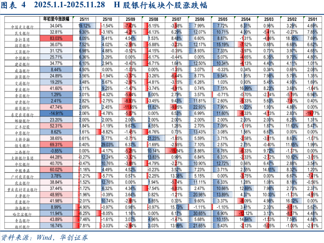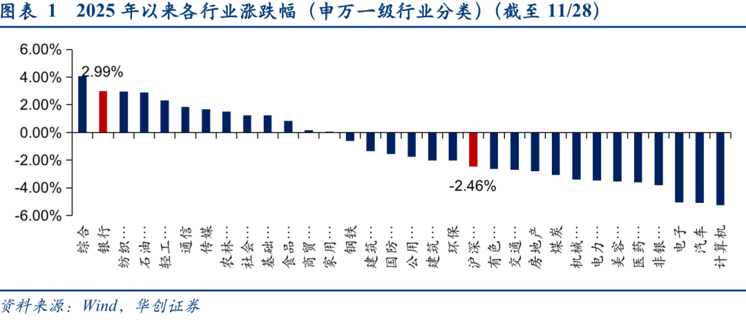 2025年11月1日至11月28日,银行业累计上涨2.99%,跑赢沪深300指数5.4pct,涨跌幅在31个申万一级行业中排名第二。11月份机构增持银行股,主要是由于基本面稳中向好、股东增持、估值修复预期等多因素共同推动。