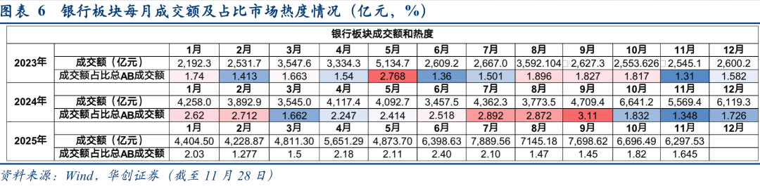 2025年11月银行板块热度较10月有所下降,银行板块交易占比环比下降0.18pct至1.65%。截止11月28日,银行板块成交额同比上升13.07%,占比AB股市场总成交额1.65%,环比下降0.18pct,不过较8、9月占比仍有提升,主要是险资等中长期资金增持银行股,并且银行股东增持彰显信心。