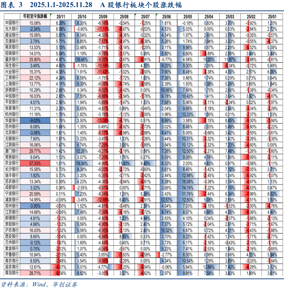 月度行情表现:2025年11月银行板块上涨,红利资产表现较好。1)行业涨跌幅:2025年11月1日至11月28日,银行业累计上涨2.99%,跑赢沪深300指数5.4pct,涨跌幅在31个申万一级行业中排名第二。11月份机构增持银行股,主要是由于基本面稳中向好、股东增持、估值修复预期等多因素共同推动。2025年11月1日至11月28日期间,国有行估值上升明显,股份行、城商行估值则较为稳定。国有行PB估值从月初的0.76X左右升至月末0.78X,城商行和股份行的PB估值基本稳定在0.60X和0.67X。11月1日至11月28日,业绩改善且中期分红派息的国股行涨幅居前,获大股东增持的南京银行也涨幅较好。涨幅靠前的银行为中国银行(8.20%)、光大银行(8.08%)、建设银行(5.81%)、交通银行(5.71%)、南京银行(5.13%)。跌幅较多的主要是青岛银行和农商行,包括青岛银行(-6.56%)、渝农商行(-6.07%)、青农商行(-2.48%)、齐鲁银行(-2.15%)、紫金银行(-2.12%)。2)利率环境:11月,10年期国债利率,中上旬保持在1.80%左右,中下旬突然上行至月末1.84%。1年期国债利率月初月末基本稳定在1.40%左右。3)行业成交额:截止11月28日,银行板块成交额同比上升13.07%,占比AB股市场总成交额1.65%,环比下降0.18pct,不过较8、9月占比仍有提升,主要是险资等中长期资金增持银行股,并且银行股东增持彰显信心。4)行业估值:银行板块当前估值处历史偏低分位。截止11月28日,银行板块(申万银行指数,801780.SI)整体PE 为 6.53 倍,近 10 年历史分位数56.18%,PB 为 0.56倍,历史分位数 32.25%。股息率 3.94%,历史分位点27.65%。