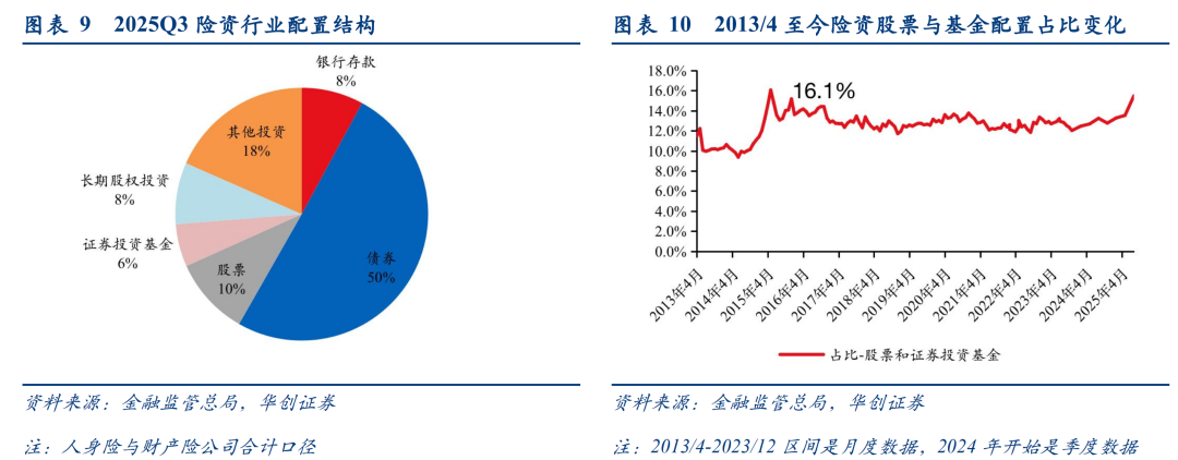 险资规模稳健增长,股票与基金配置环比提升。截至2025Q3,险资资金运用余额达到37.5万亿。人身险和财产险公司合计来看,截至2025Q3,债券配置占比50.3%,季度环比-0.8pct;股票占比10%,基金5.5%,环比均有所提升,长期股权投资占比7.9%(环比持平),与股票、基金合计23.4%,环比+2pct。