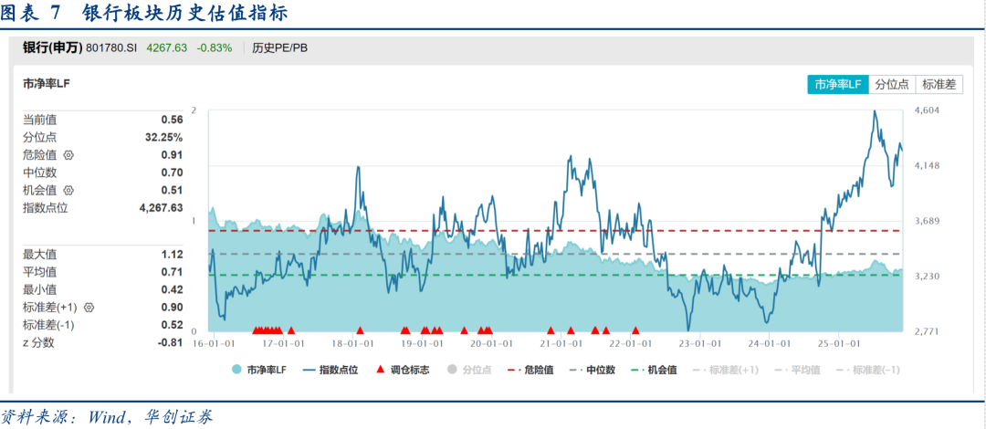 银行板块当前估值处历史偏低分位。截止11月28日,银行板块(申万银行指数,801780.SI)整体PE 为 6.53 倍,近 10 年历史分位数56.18%,PB 为 0.56倍,历史分位数 32.25%。股息率 3.94%,历史分位点27.65%。