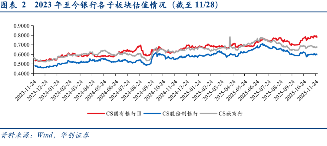 具体看银行细分板块,2025年11月1日至11月28日期间,国有行估值上升明显,股份行、城商行估值则较为稳定。国有行PB估值从月初的0.76X左右升至月末0.78X,城商行和股份行的PB估值基本稳定在0.60X和0.67X。