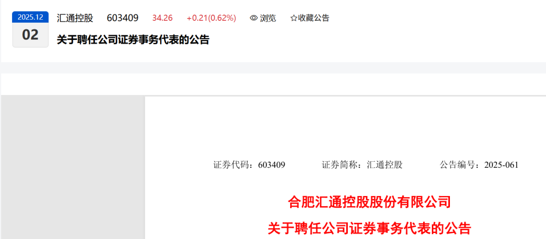 合肥汇通控股股份有限公司(以下简称“公司”)于2025年12月1日召开了第四届董事会第十七次会议,审议通过了《关于聘任公司证券事务代表的议案》,同意聘任宁航先生为公司证券事务代表,协助董事会秘书履行职责,任期自董事会会议审议通过之日起至第四届董事会任期届满之日止。