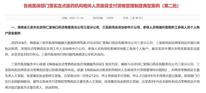 2025年4月,海南省三亚市医保局根据大数据筛查线索,对北京同仁堂海口药店有限责任公司三亚分公司、三亚新风街店两家药店开展行政执法检查,发现定点零售药店及其工作人员协助中介公司、参保人员有组织套刷异地职工医保个人账户,购买安宫牛黄丸并转卖套现非法获利,涉及资金330万余元。三亚市医保局已将问题线索移送公安机关侦办。