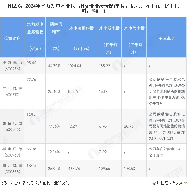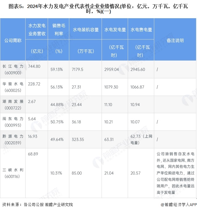 从水力发电代表企业的业绩情况来看,水力发电行业的毛利率均值接近40%;长江电力和华能水电的装机容量、水电发电量、水电售电量均处于行业领先位置。上市企业具体的业绩情况如下表所示: