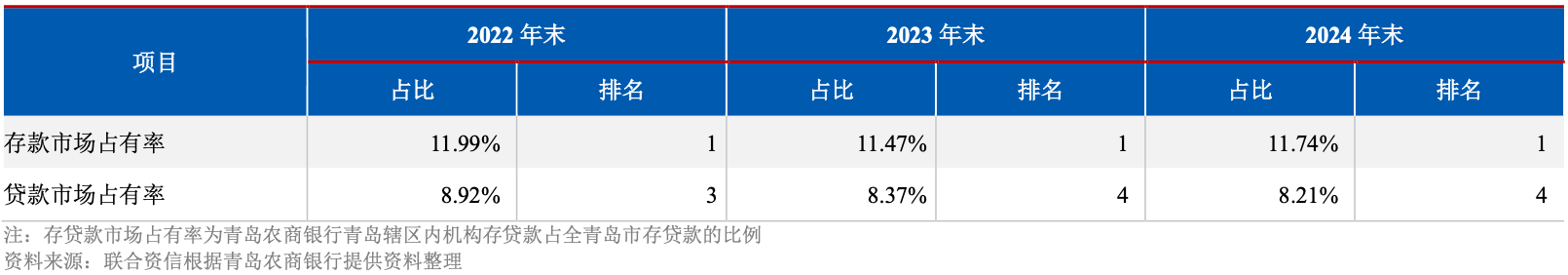 联合资信评级报告披露,2022-2024年,该行存款市场占有率始终维持在青岛市之首;