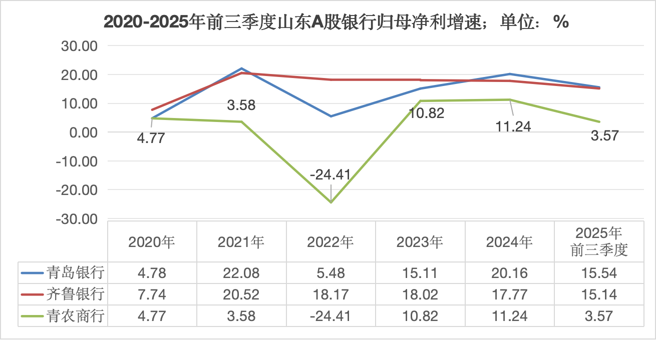 今年前三季度,青岛银行、齐鲁银行利润增速更是跃升至A股上市银行第一位、第二位,而青农商行仅为第二十位,已被甩开10个百分点的差距。