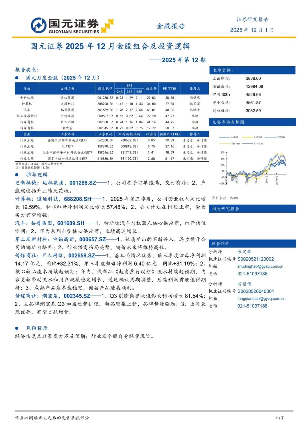 本报告摘自国元证券2025年12月1日已发布的《国元证券2025年12月金股组合及投资逻辑——2025年第12期》,具体报告及分析内容请详见报告。若因对报告的摘编等产生歧义,应以报告发布当日的完整内容为准。