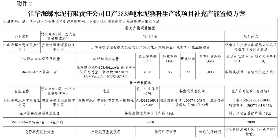 另外2000t/d产能用于补充江华海螺水泥一条4500t/d熟料生产线,补充后产能为5833t/d,置换比例1.5:1。