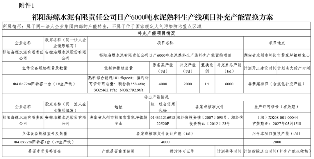 置换方案显示,祁阳海螺水泥退出1条4000t/d熟料生产线,其中2000t/d产能用于补充同厂区另一条4000t/d熟料线,补充后产能为6000t/d,置换比例1:1。