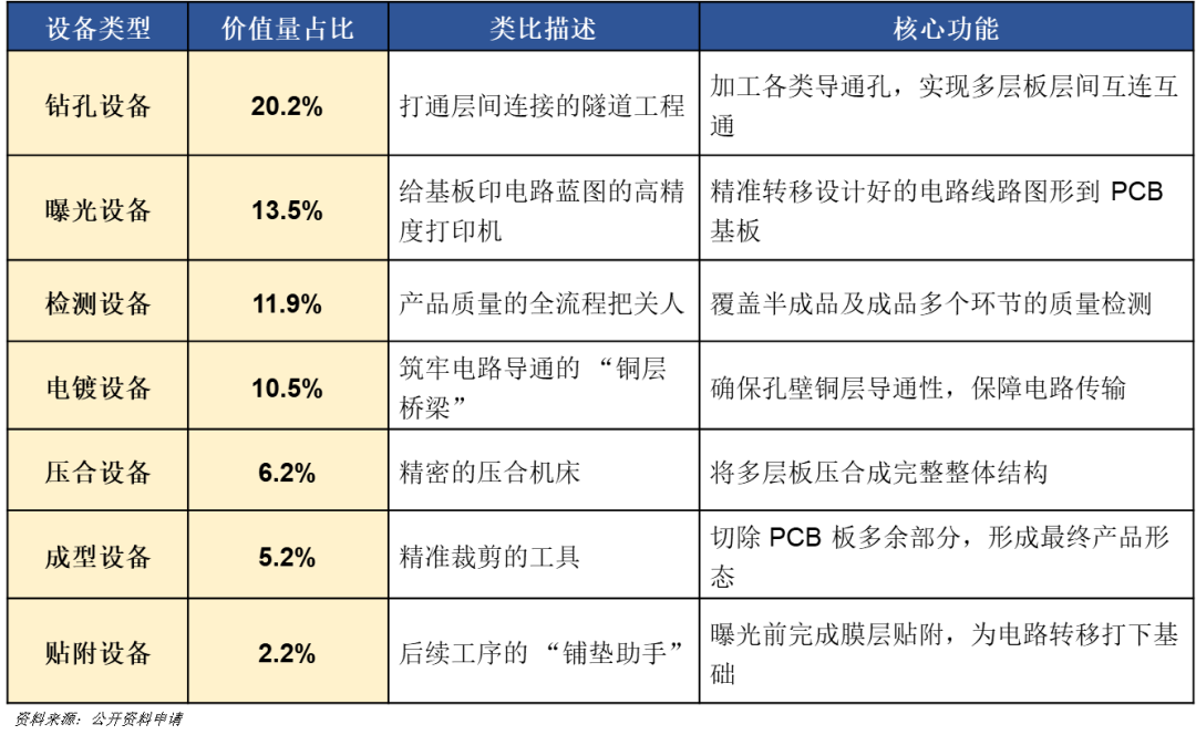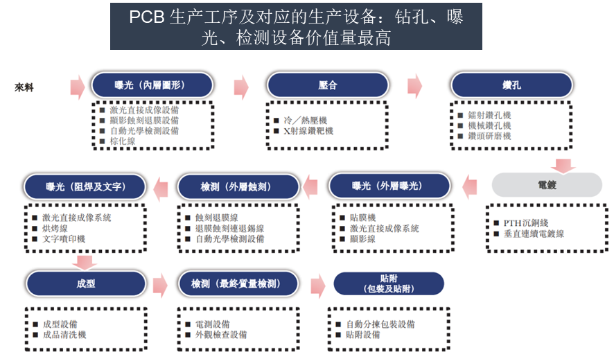 PCB生产如同电子制造业的精密组装线,涵盖七大核心环节,其中钻孔、曝光、检测设备因价值量最高而成为产业链的“核心装备”。