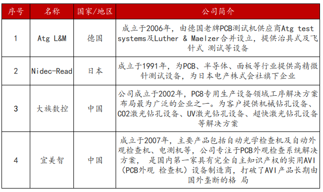竞争格局上,检测设备主要涵盖外观检测与电学检测两大类别:海外有德国 Atg L&M、日本 Nidec-Read 等企业布局,国内则以深圳大族数控、宜美智等企业为核心力量,形成国内外企业共同竞争的市场格局。