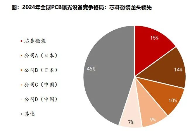 竞争格局上,海外有以色列 Orbotech、日本 ORC 等企业,国内以芯碁微装(2024 年市占率 15%,全球龙头)、大族数控等为核心力量。AI PCB 对线宽精度的提升带动设备价值量增长,行业将享受技术升级红利。