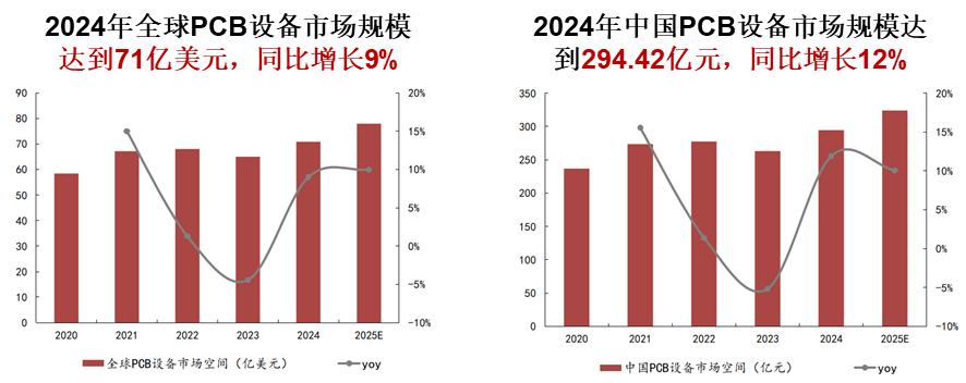 作为全球 PCB 产业的核心阵地,中国市场增速更胜一筹,如同领跑的快车:2024 年中国 PCB 设备市场规模已达 294.42 亿元,2020-2024 年 CAGR 为 5.6%,高于全球平均水平,预计 2025 年将突破 324 亿元,持续释放增长潜力。