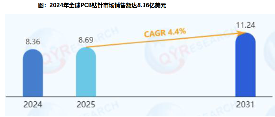 据 QYR(恒州博智)统计及预测,全球 PCB 钻针市场如同稳步扩容的赛道,2024 年销售额已达 8.36 亿美元,预计 2031 年将攀升至 11.24 亿美元,年复合增长率(CAGR)为 4.4%,长期增长态势明确。