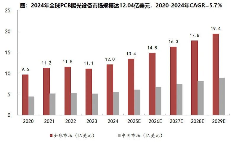 全球 PCB 曝光设备市场增长稳健,据 Prismark 数据,2020-2024 年从 9.6 亿美元增至 12 亿美元(CAGR=5.7%);受益于 AI PCB 对高精度、低成本、快迭代的需求,预计 2029 年达 19.4 亿美元(2024-2029 年 CAGR=10%)。