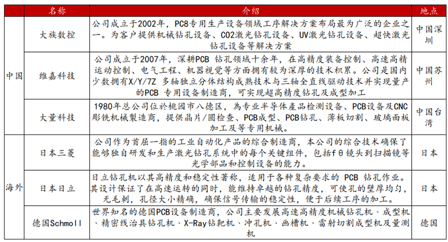 在竞争格局上,国内数控钻机高端市场目前仍由日本日立、德国 Schmoll、日本三菱等海外企业牢牢占据,而以大族数控(2024 年国内市占率 30%)、苏州维嘉、大量科技、帝尔激光为代表的国内企业,如同加速追赶的挑战者,正凭借技术突破有望缩小差距、实现弯道超车。