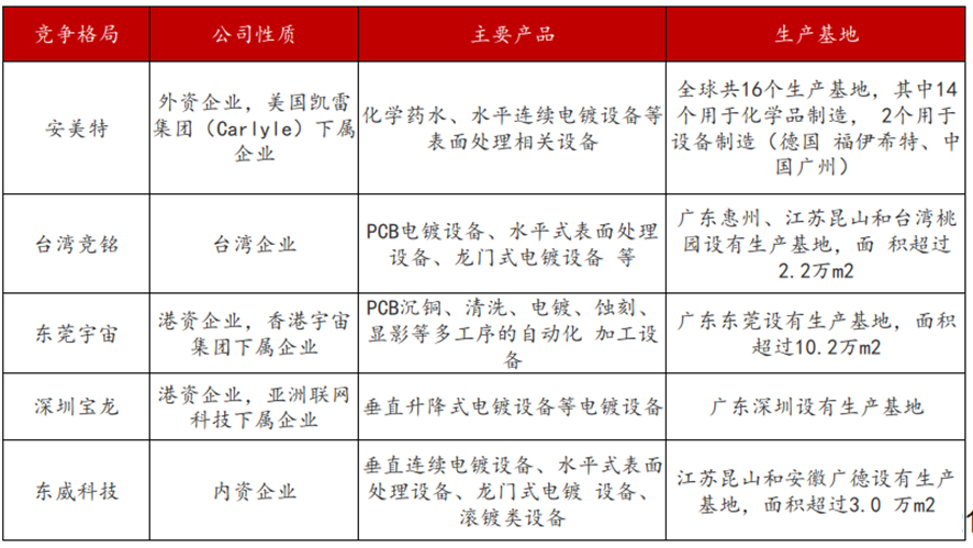 竞争格局上,PCB 电镀设备主要分为三类:垂直连续式电镀设备(东威科技占据国内 50% 以上市占率)、垂直升降式电镀设备(台湾竞铭、东莞宇宙等为主力)、水平连续式电镀设备(以安美特为代表),各类设备对应不同市场需求形成差异化竞争。